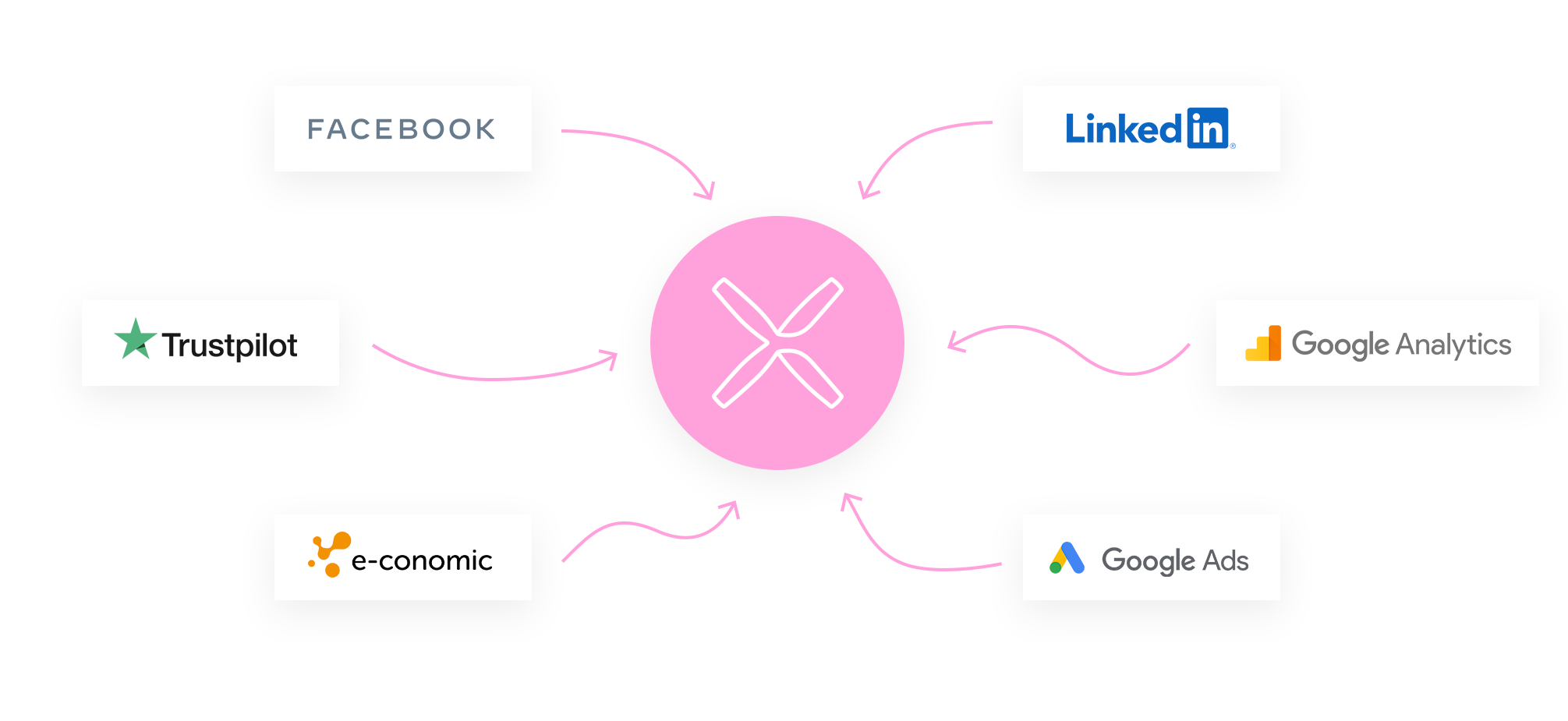 OP'N kan integreres med Google, Facebook, Trustpilot, Dinero, e-conomic og mere,